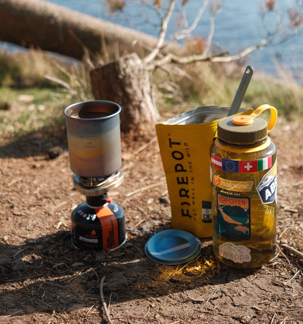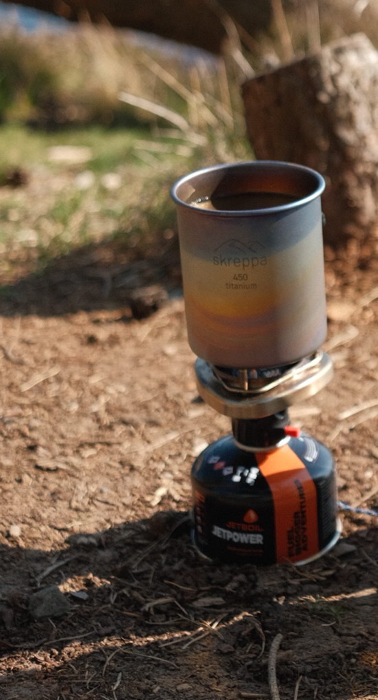 Single wall titanium cup & lid with fold-flat handle for storage and transport. Can be used over direct flame or other heat source to boil water or heat food.